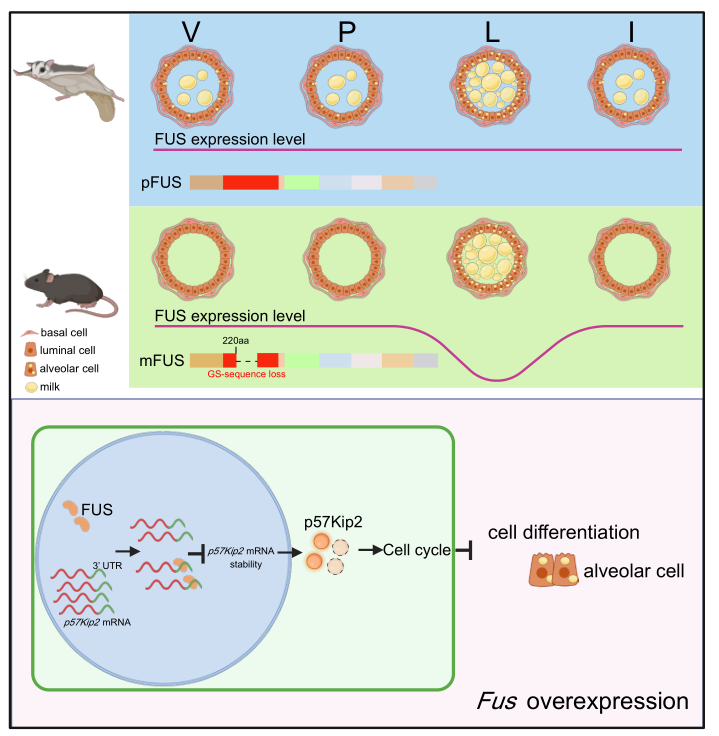 小鼠的乳腺发育被精密调控,呈现动态循环,仅在泌乳期分泌乳汁。焦保卫研究团队发现,与胎盘哺乳动物不同的是,有袋类动物蜜袋鼯缺乏对乳汁分泌的精确调节,其乳腺发育不存在动态循环,即使在后代不需要乳汁的青春期也可以合成乳汁成分,能量浪费,泌乳调控能力低效。进一步探究发现,RNA结合蛋白FUS是这种低效率的部分原因。FUS蛋白的氨基酸序列在进化中缺失一段甘氨酸丝氨酸(GS)富集序列,使得真兽动物如小鼠和蝙蝠的FUS表达水平在泌乳期被显著下调,从而促进乳汁分泌。而有袋类动物如蜜袋鼯,由于GS富集序列的保留,其FUS水平在乳腺发育各时期保持恒定,泌乳能力较低。在转基因小鼠模型中,通过在泌乳期特异上调FUS水平,研究团队发现泌乳期过量FUS水平通过细胞周期相关蛋白而抑制乳腺上皮细胞分化,导致泌乳失败和幼崽饥饿致死(图1)。临床上,FUS水平与哺乳期妇女的产奶量呈负相关。总的来说,这些发现揭示了FUS作为产奶量的负调节因子,为有袋动物到真兽哺乳动物的产奶效率的建立提供了调控机制。
