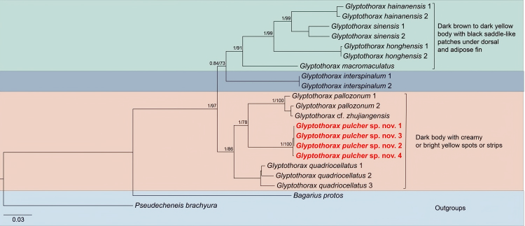 美丽纹胸鮡在形态学上与分布于红河水系的四斑纹胸鮡最为接近,但可就眼后方无黄色斑点、头背部皮肤光滑、胸部附着器形态与较短的脂鳍基予以区别。基于线粒体基因COⅠ与Cyt b序列构建的系统发育结果强烈支持了美丽纹胸鮡的有效性,并揭示美丽纹胸鮡与白线纹胸鮡互为姐妹群。基于COI基因序列K2P模型估算的遗传距离显示,美丽纹胸鮡与近缘种之间的遗传距离范围为4.7%至6.0%。