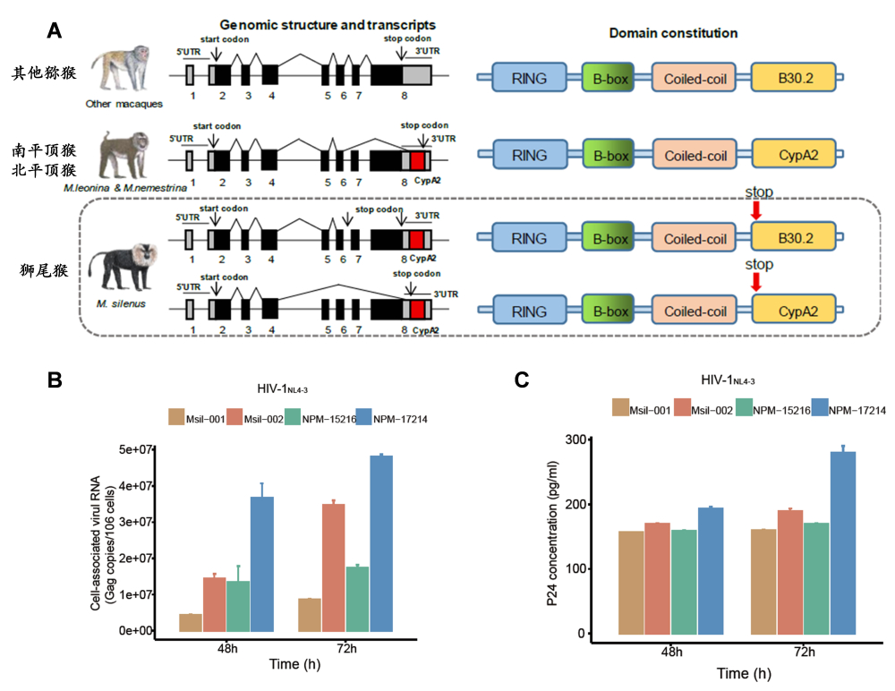 图注:不同猕猴TRIM5基因结构以及狮尾猴外周血细胞HIVNL4-3病毒感染实验。图A表示不同猕猴TRIM5基因和主要转录本的剪接形式,和南、北平顶猴一样,狮尾猴的TRIM5基因同样存在CypA2基因的插入;图B和C表示狮尾猴(Msil)和北平顶猴(NPM)外周血PBMC细胞在感染HIVNL4-3病毒42h和72h后通过检测病毒RNA和P24蛋白所示的病毒载量。