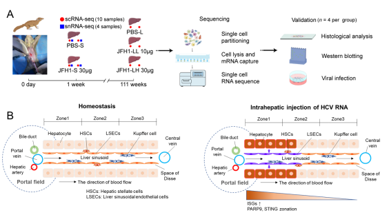 图1. HCV感染诱导树鼩肝脏广泛干扰素扰动与分区重构。A. 树鼩肝脏单细胞测序分析与实验验证流程图;B. 树鼩肝小叶分区模式图(左)与接种HCV RNA后树鼩肝脏免疫微环境动态变化图(右)。