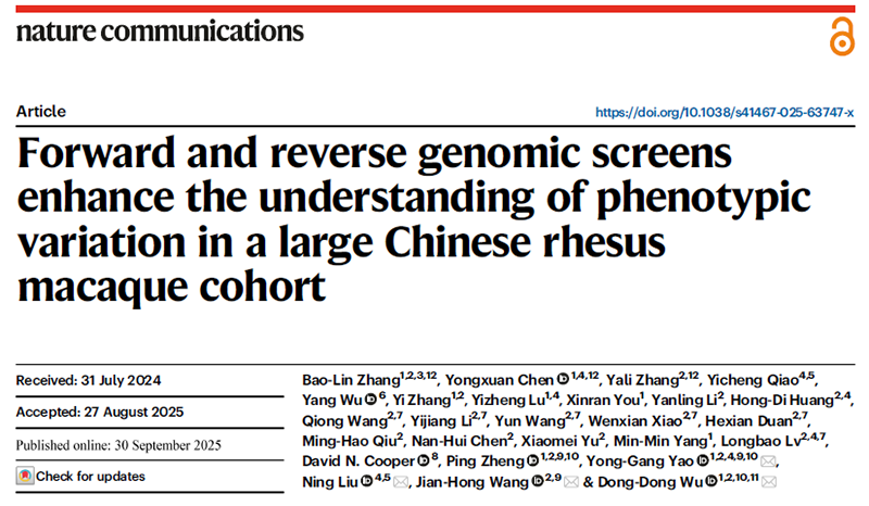 总之,通过大规模猕猴遗传和表型数据的采集,该研究首次刻画了中国猕猴的突变景观图谱,解析了中国猕猴部分表型背后的遗传基础。另外,通过反向遗传学的思路,发掘到一个潜在的自发疾病动物模型。作为项目I期的研究,目前还存在一定的局限性,如样本量还比较有限,测定的表型指标还不够多。未来,随着队列样本量和测定的表型指标数的不断扩大,有望揭示更多的猕猴表型与遗传的奥秘,使得猕猴资源得到充分挖掘和利用。该研究结果以Forward and reverse genomic screens enhance the understanding of phenotypic variation in a large Chinese rhesus macaque cohort为题,发表在Nature Communications上(文章链接https://www.nature.com/articles/s41467-025-63747-x)。
