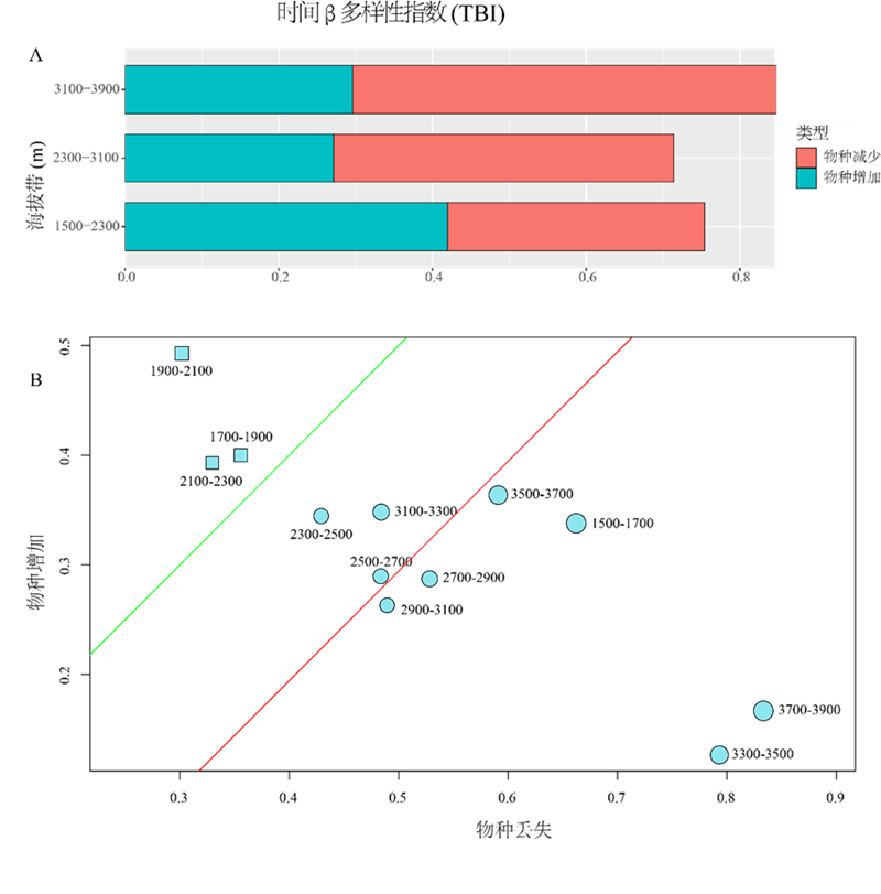 图3 黎贡地区大中型哺乳动物不同海拔段干湿季时间β多样性变化:(A) 相较于暖湿季节,低、中、高三个海拔段在干冷季节物种增加和减少的比例均值;(B) 相较于暖湿季节,各海拔带在干冷季节物种增加(纵坐标)和减少(横坐标)的比例。