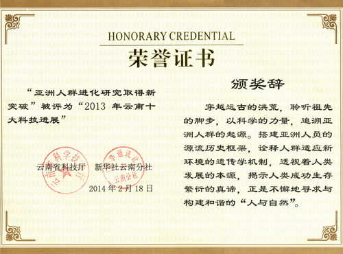 2014年2月18日,2013年云南十大科技进展评选结果揭晓。张亚平研究团队主持完成的项目“亚洲人群进化研究取得新突破”成果喜获该荣誉。