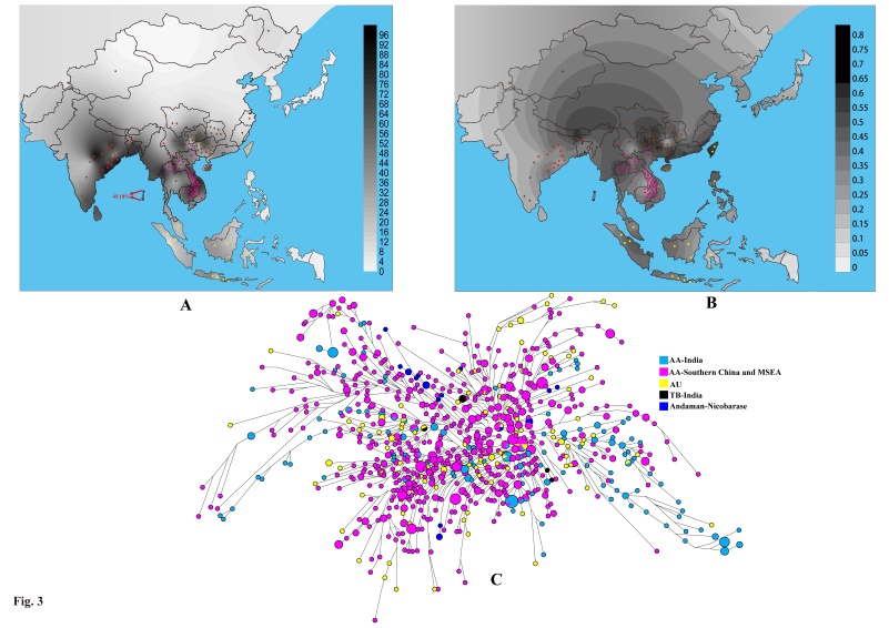 为了系统探讨这一问题,中国科学院昆明动物研究所宿兵实验室(助理研究员张晓明等)与柬埔寨金边皇家大学和泰国清迈大学等合作,在柬埔寨、泰国和中国云南系统采集了22个南亚语系人群的646个男性样本,并详细分析了这些人群的Y-染色体遗传多样性;在全面收集了其他人群的Y-DNA和mtDNA数据并综合深入分析后发现,父系支系O2a1- M95在所有南亚语系人群中的频率均非常高(平均约为65%),这一支系在旧石器晚期约2-4万年前起源于中国南部的侗傣语系(Daic)人群中,并在末次冰盛期(Last Glacial Maximum,1.9-2.6万年前)之后约1.5万年前大面积扩散到了东南亚,而后约在约1万年前向西扩散到了印度次大陆;这一支系的扩散过程,自始至终伴随着南亚语系人群在整个亚洲南部的迁徙与扩散以及与多个不同语系人群的融合,而这个过程具有性别特异性融合的特性,即主要是迁徙的男性与本土的女性婚配融合。该研究结果近期发表在《Scientific Reports》杂志上(http://www.nature.com/articles/srep15486)。