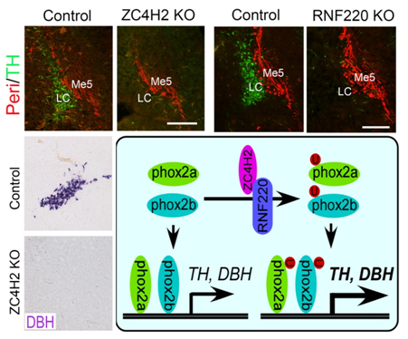 去甲肾上腺素是外周系统一类常见且非常重要的神经递质,可引起小血管收缩和血压增加。在中枢神经系统(脑)中,也存在一群特异性以去甲肾上腺素为神经递质的神经元;这些神经元主要分布于脑干的蓝斑核(Locus Coeruleus)中,它们的轴突投射至整个脑中,调控各个脑区神经元的活性。众多证据表明,中枢去甲肾上腺素系统和精神类疾病(如认知障碍、焦虑和抑郁)以及神经退行性疾病(帕金森症和阿兹海默症)紧密相关。蓝斑核的去甲肾上腺素能神经元产生于胚胎发育E10.5天的第一菱脑原节(rhombomere 1),并于胚胎发育后期迁移到脑桥。现已发现很多信号分子通路,如FGF8、BMP、Wnt和Notch,对这群神经元祖细胞的特化起到重要作用。另外,一些转录因子(如Phox2a和Phox2b)也对去甲肾上腺素能神经元的分化和维持起关键作用。Phox2a和Phox2b直接调控去甲肾上腺素生物合成的关键酶(酪氨酸羟化酶TH和多巴胺-β-羟化酶DBH)的表达, Phox2a或者Phox2b的基因敲除都会造成去甲肾上腺素能神经元缺失。