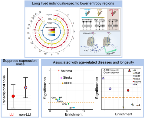 在衰老过程中,生物系统往往经历从有序到紊乱的转变。过去的研究已经发现以DNA甲基化为代表的表观遗传修饰会随年龄逐渐混乱程度上升,但这一趋势在健康老化的代表——长寿人群中是什么情形仍知之甚少。