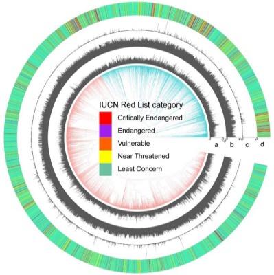 图1.全球陆生鸟类物种灭绝风险的系统发育分布图2.人为干扰对于全球陆生鸟类(a)、雀形目鸟类(b)和非雀形目鸟类(c)灭绝风险的影响效应系数