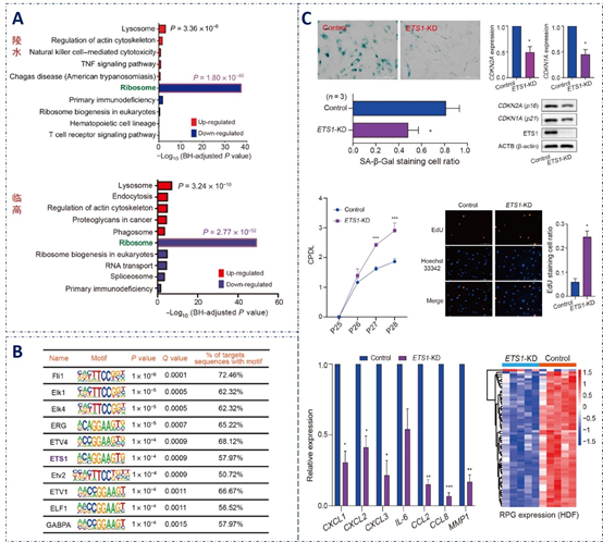 健康长寿/老化是内在遗传因素和外在环境因素等共同作用的结果。鉴于早期研究表明,长寿遗传力较低(约25%),长寿人群在基因组DNA层面携带长寿相关基因变异数量较少,提示长寿人群在基因表达调控层面可能潜藏有更多的健康保护因子。鉴于此,中国科学院昆明动物研究所孔庆鹏研究员团队,联合中南大学湘雅医院李吉教授团队及海南医学院蔡望伟教授团队,新获得并分析海南省陵水县和临高县长寿人群271例(185例长寿老人,86例老年对照)外周血白细胞转录组数据(RNA-seq)。信息学分析发现,长寿老人自噬-溶酶体通路基因显著高表达,这与团队早期基于海南省澄迈、万宁地区长寿人群的研究结果一致(Genome Research, 2018)。有趣的是,研究人员于两批长寿人群中均发现一新的且极其显著的信号,即核糖体通路基因显著低表达(陵水:P=1.80e-40;临高:P=2.77e-52);进一步分析发现,长寿老人核糖体编码基因低表达的转录调控因子很可能是ETS Proto-Oncogene 1(ETS1)。进而,研究人员利用人真皮成纤维细胞(HDF)和IMR-90等复制衰老细胞模型进行功能验证,发现敲降ETS1可降低核糖体编码基因表达,并延缓细胞衰老。因此,该研究表明,降低核糖体参与的蛋白质翻译功能对延缓衰老/健康老化具有重要作用,转录调控因子ETS1参与该过程调控。