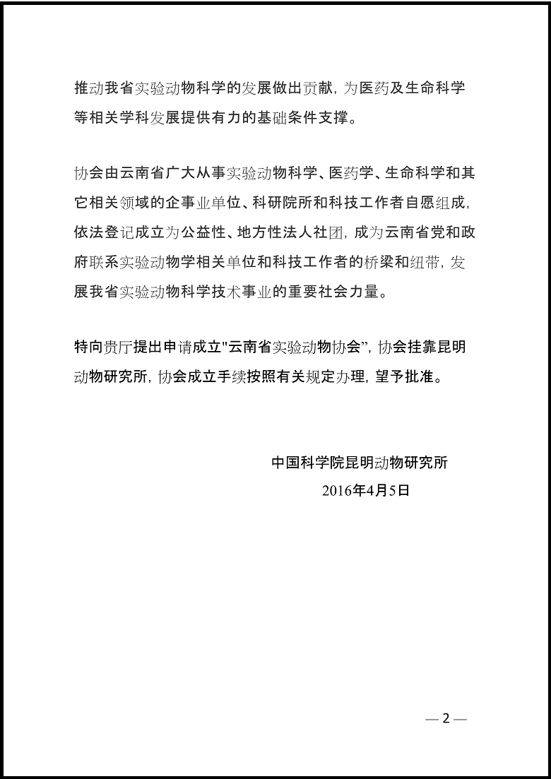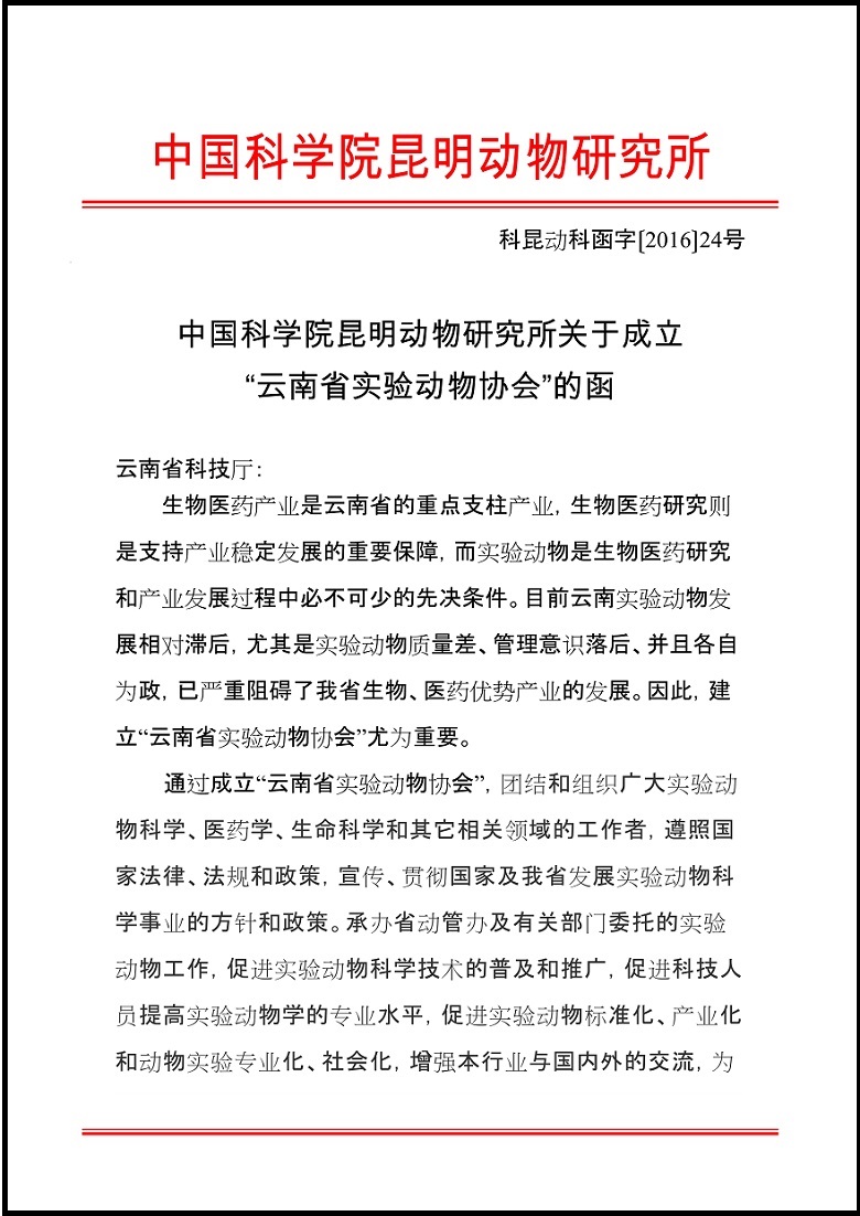 中国科学院昆明动物研究所关于成立“云南省实验动物协会”的函