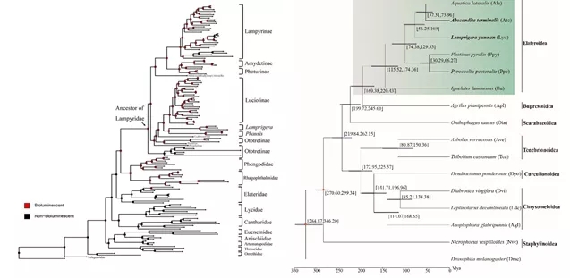 分子系统树显示扁萤(Lamprigera)与熠萤亚科更近的关系,左图为线粒体基因组和核rDNA树(Chen et al., 2019),右图为全基因组系统发育树(Zhang et al., 2020)