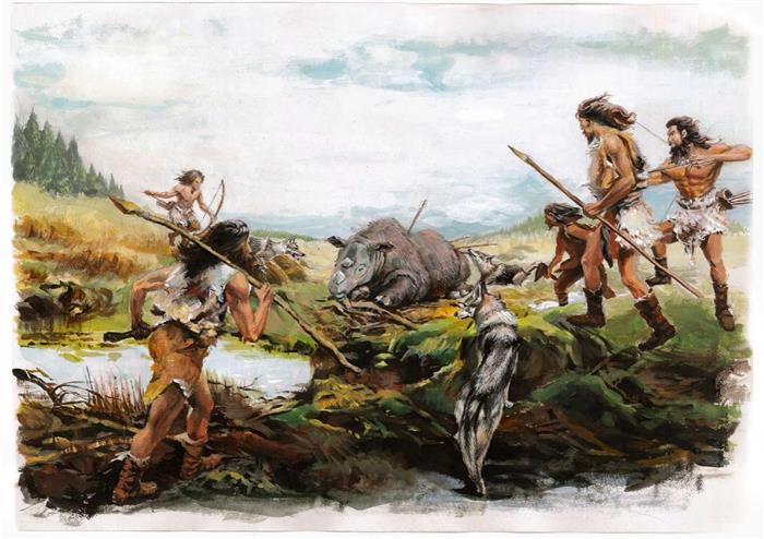 5,200年前青藏高原东北部马家窑文化先民狩猎印度野牛和苏门答腊犀牛的场景复原图