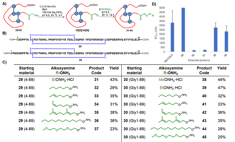 蛋白质趋化因子CCL4是HIV辅助受体CCR5的配体。作者利用该策略对CCL4的 N-端进行转胺化修饰,快速得到了一系列修饰蛋白质29-45。抗HIV-1活性体外实验表明,带修饰蛋白质30和31的抗HIV-1活性相较于表达的CCL4活性有显著提高。该实验表明,通过蛋白质化学合成与定点修饰联用可以在短时间内得到大量不同修饰的蛋白质,这在很大程度上为抗HIV蛋白质类药物的制备提供了技术手段。
