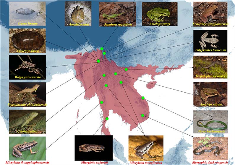 2024年度,该课题组与泰国帕尧大学Chatmongkon Suwannapoom、越南科学院热带生物研究所Nguyen Ngoc Sang,以及国内多家单位(云南大学、西南大学和西华师范大学)通过开展合作研究,在印缅生物多样性热点区域发表7个新种和11个国家新纪录种(图1)。上述发现进一步丰富了我们对该地区两栖爬行动物物种多样性的认识,为区域生物多样性保护提供了重要的科学数据支撑。