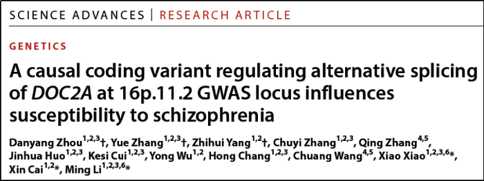 在此背景下,2026年1月16日,中国科学院昆明动物研究所李明团队与肖潇团队在Science Advances期刊发表最新研究(标题A causal coding variant regulating alternative splicing of DOC2A at 16p.11.2 GWAS locus influences susceptibility to schizophrenia),首次将精神分裂症的遗传风险锁定在一个由可变剪接产生、此前从未被注释的全新蛋白质上,并系统阐明了其驱动疾病的完整分子与行为学因果链条,实现了从遗传关联到机制解析的重要跨越。