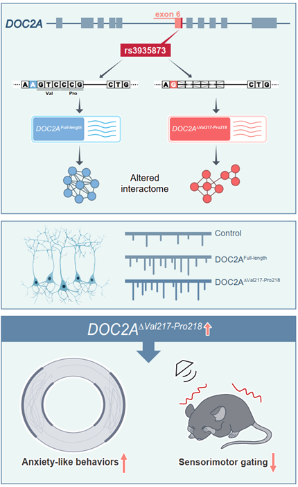 rs3935873变异在人类中除增加精神分裂症发病风险,也与海马体积相关。为验证该新异构体的直接致病作用,研究团队在小鼠海马体中分别过表达DOC2A∆Val217-Pro218和全长DOC2A。结果显示,仅表达新型剪接体的小鼠出现显著的精神分裂症相关行为缺陷,而全长蛋白则无此效应,表明特定的剪接异常,而非基因本身的整体功能失调,是致病的关键。