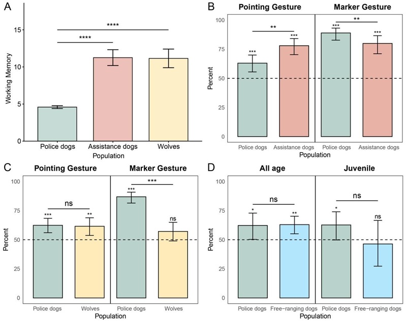 通过与公开数据中的幼年期辅助犬和人工抚育狼进行对比,研究发现在工作记忆中,警犬的表现优于辅助犬和狼;在手势指示中,警犬的表现显著低于辅助犬,而与狼接近;在标记物指示上,警犬的表现显著高于辅助犬和狼。进一步与流浪犬对比,我们发现这些警犬在手势指示上和流浪犬之间不存在显著差异。