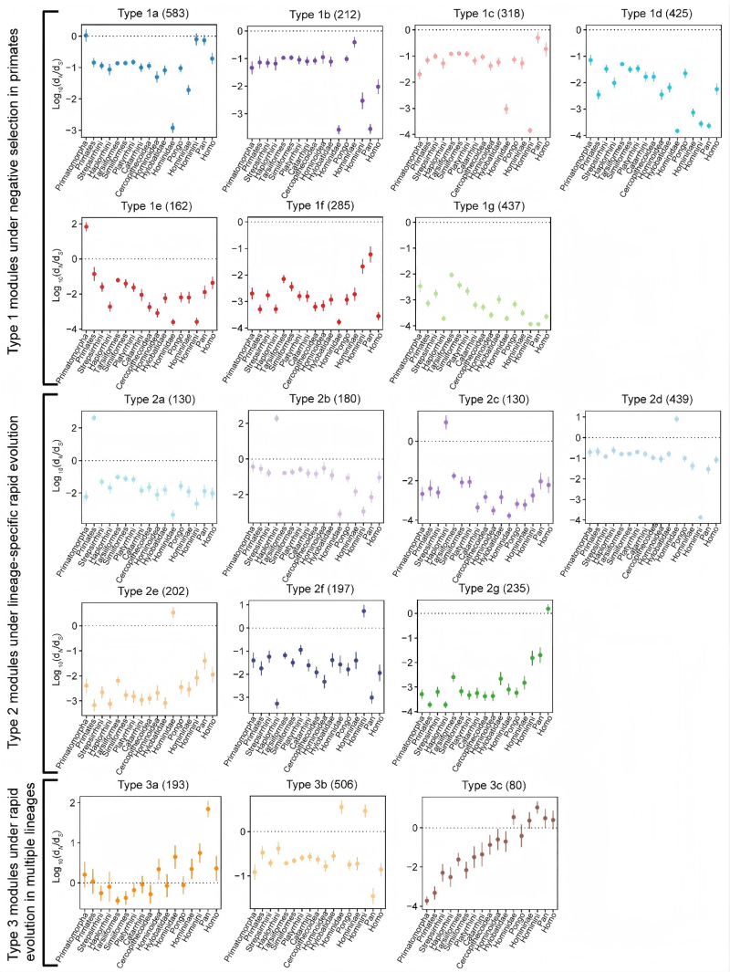 研究团队利用长读长基因组测序数据与新型算法(TOGA),成功构建了涵盖广泛灵长类物种抽样的免疫基因图谱。通过解析这些基因在灵长类生命演化树17个关键节点上的选择压力,发现灵长类的免疫基因并非各自为战,而是以“模块”为单位协同演化。成功鉴定了17个演化模块,并根据其选择模式分为三类:1型模块(7个):在全部谱系中均受到强烈的纯化选择,功能上富集于炎症反应,如同免疫系统的“稳定基石”;2型模块(7个):在特定谱系中经历快速演化,驱动了谱系特异的免疫创新;3型模块(3个):在多个谱系中均表现出加速演化,显示出跨谱系的共同适应性演化。其中最引人注目的是3c型模块,该模块的演化压力从灵长类早期祖先开始便持续增强,并在整个人科动物谱系中达到高峰。该模块基因显著富集于对抗HIV-1和流感病毒的响应通路。这一跨越多个关键演化节点的、梯度式的选择压力增强模式,暗示了一场贯穿灵长类演化史大部分历程的、与慢病毒家族的长期‘军备竞赛’。