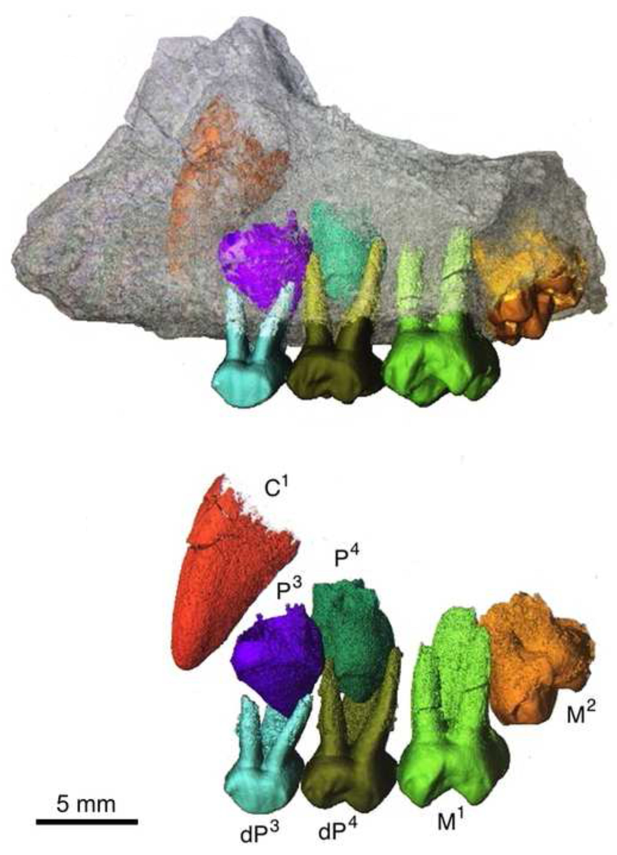 研究团队还发现,此前发现于印度中中新世(距今1.25亿-1.38亿年)的一枚下第三臼齿Kapi ramnagarensis, 不是长臂猿,而是另一种原始的小型猿类。