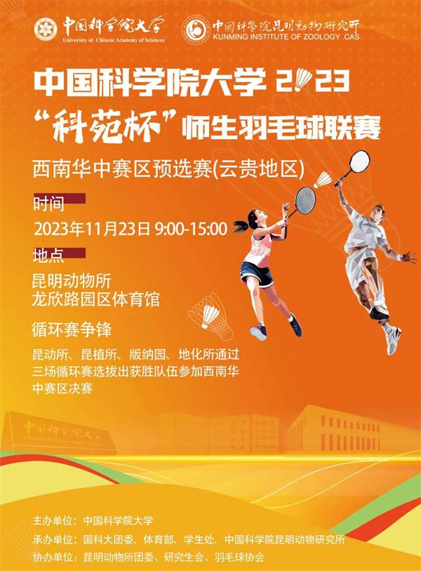 11月23日,由中国科学院昆明动物研究所承办的中国科学院大学(以下简称国科大)2023年“科苑杯”师生羽毛球联赛西南华中赛区云贵地区选拔赛成功举办。地球化学所党委书记陈敬安和昆明动物所党委委员、党群人事部部长黄加元为本次活动开球。