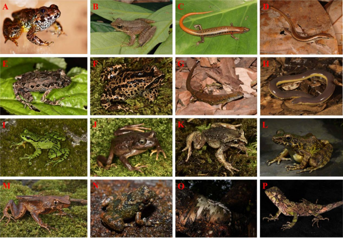 A. Limnonectes splendissimus; B. 麻点臭蛙; C. Scincella auranticaudata; D.Scincella honbaensis; E. 白缘掌突蟾; F. 豹斑齿突蟾; G. 滇南棱蜥; H. 滇西鱼螈; I. 古道湍蛙; J. 傈僳齿突蟾; K. 山精齿突蟾; L. 苏典臭蛙; M. 铜壁关角蟾; N. 铜壁关小山蛙; O. 盈江伞虎; P. 赵氏树蜥